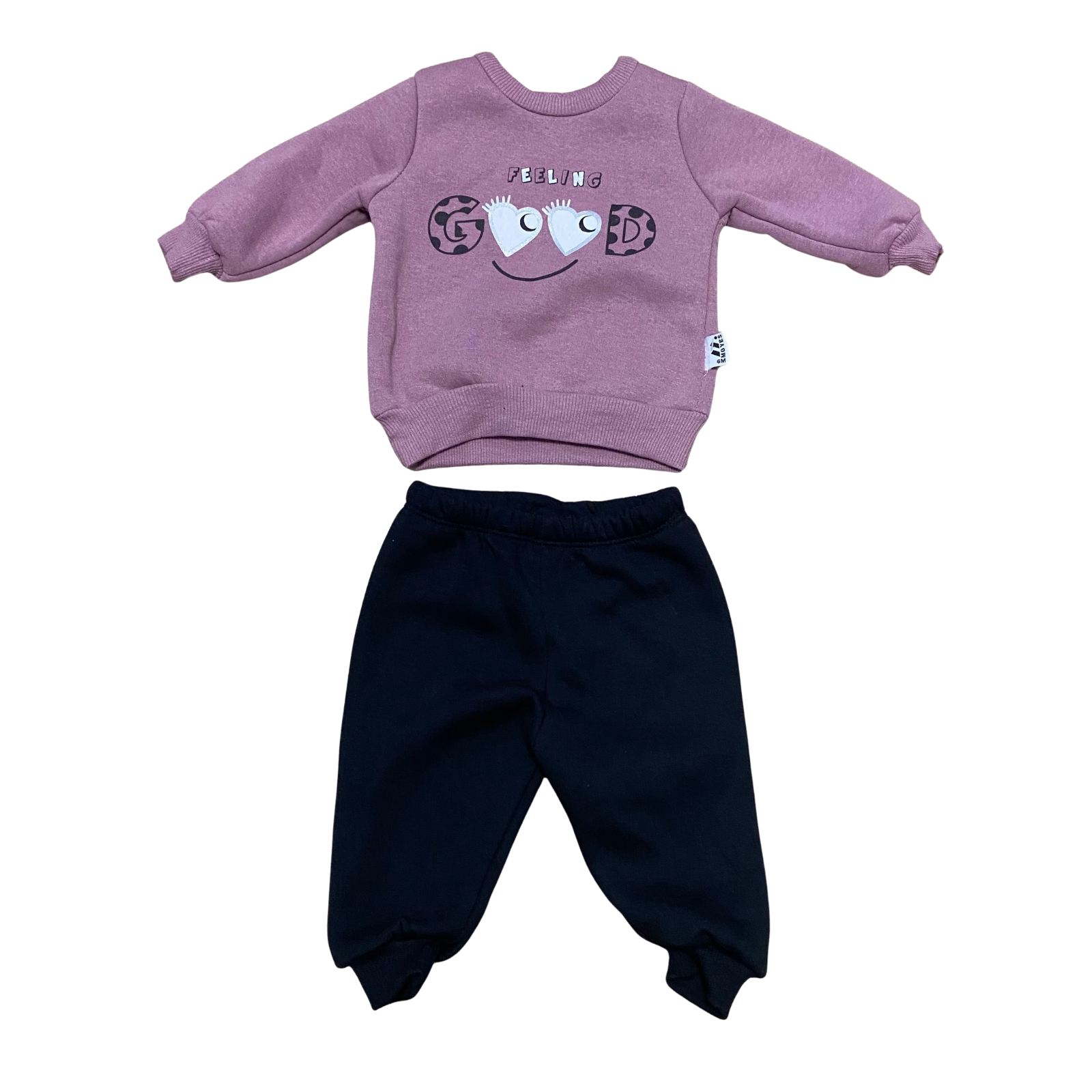 Compleu vesel pentru fetițe, format din bluză mov cu imprimeu „FEELING GOOD” și pantaloni negri comozi. Realizat din bumbac moale și plăcut la atingere, acest set oferă libertate de mișcare și confort pe tot parcursul zilei. Bluza are un design modern cu detalii vesele, perfect pentru o stare de bine și un look casual de zi cu zi. Ideal pentru grădiniță, plimbări sau joacă, acest compleu aduce zâmbete și energie pozitivă în garderoba celor mici.