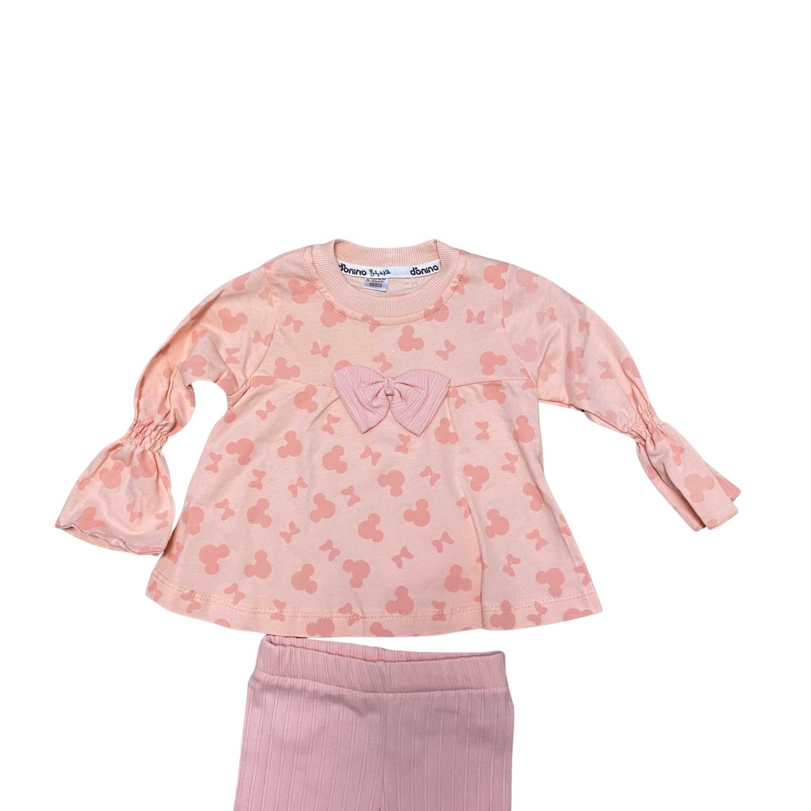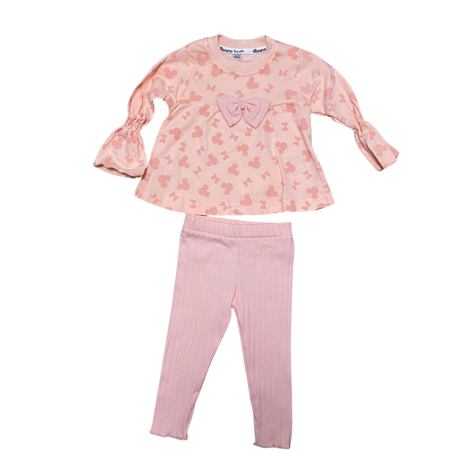 Compleu drăgălaș pentru fetițe, format din bluză roz pudrat cu imprimeu de fluturi și fundiță aplicată în față, alături de colanți asortați din material elastic cu dungi fine. Bluza are mâneci evazate cu elastic, oferind un aer elegant și confortabil. Realizat din bumbac moale și plăcut la atingere, setul este ideal pentru purtare zilnică, grădiniță sau ocazii speciale. Designul pastelat aduce un plus de gingășie și rafinament în garderoba celor mici.