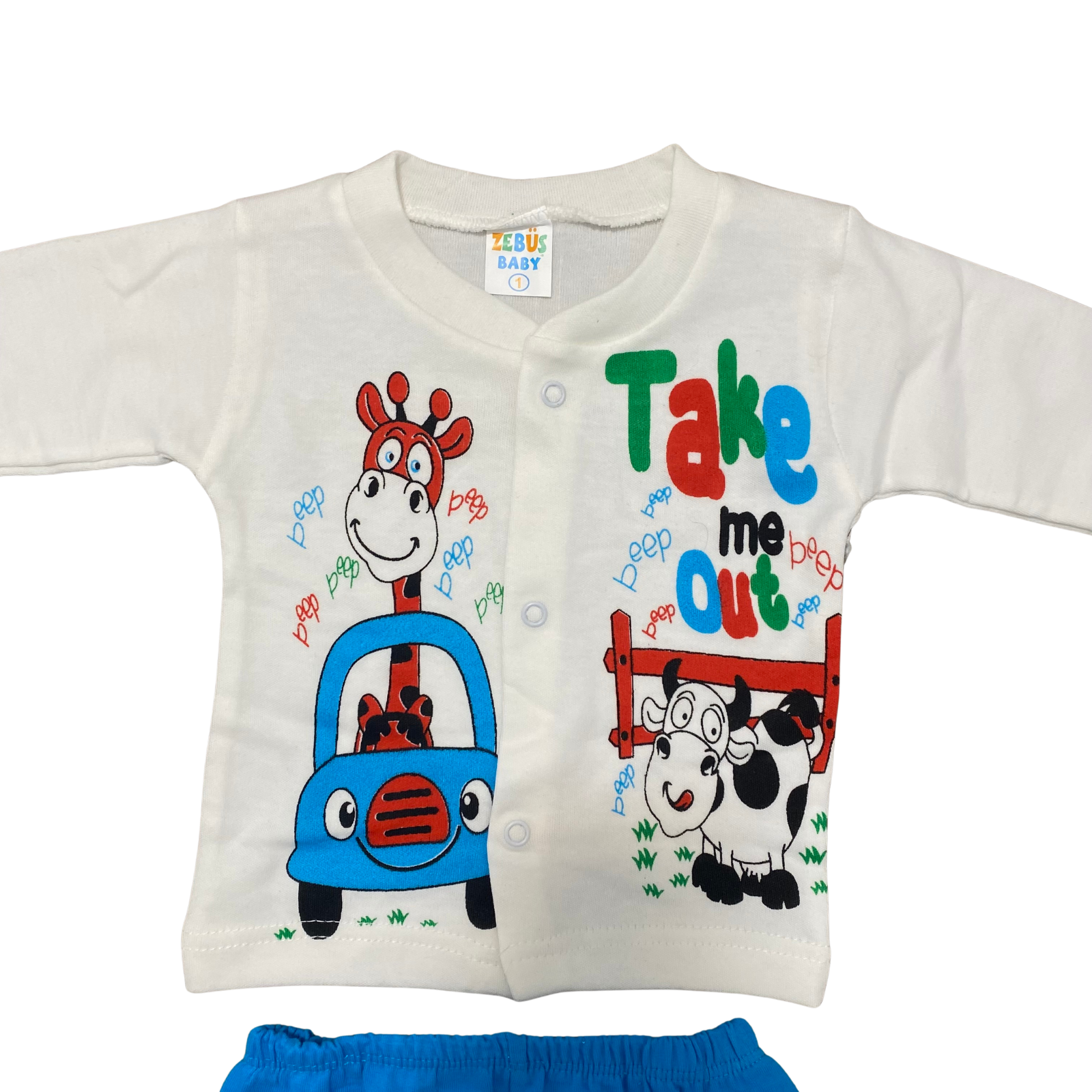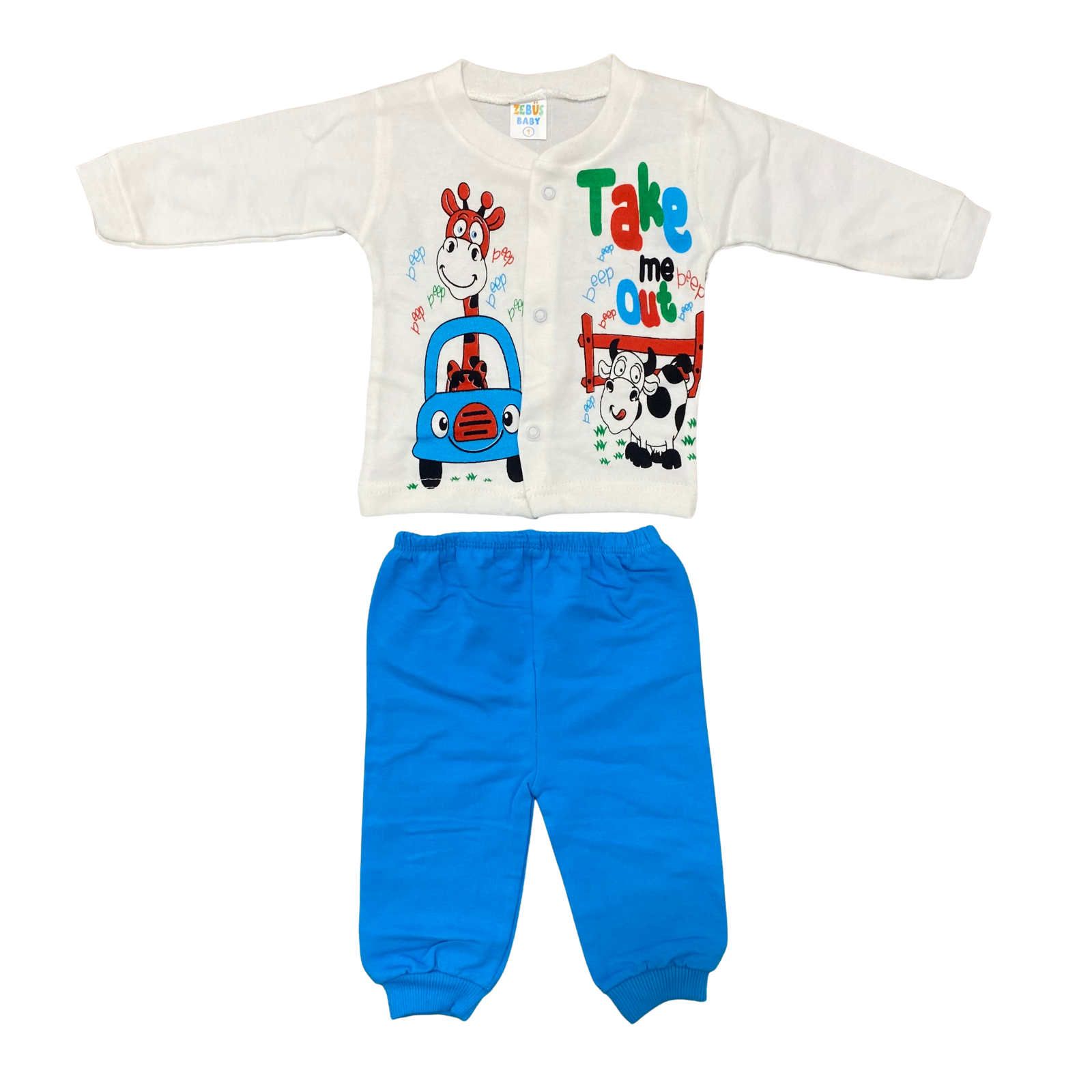 Un set vesel și plin de energie, ideal pentru micuți! Girafa simpatică la volan și vacuța prietenoasă aduc zâmbete și joacă, iar pantalonii albaștri comozi completează perfect ținuta.