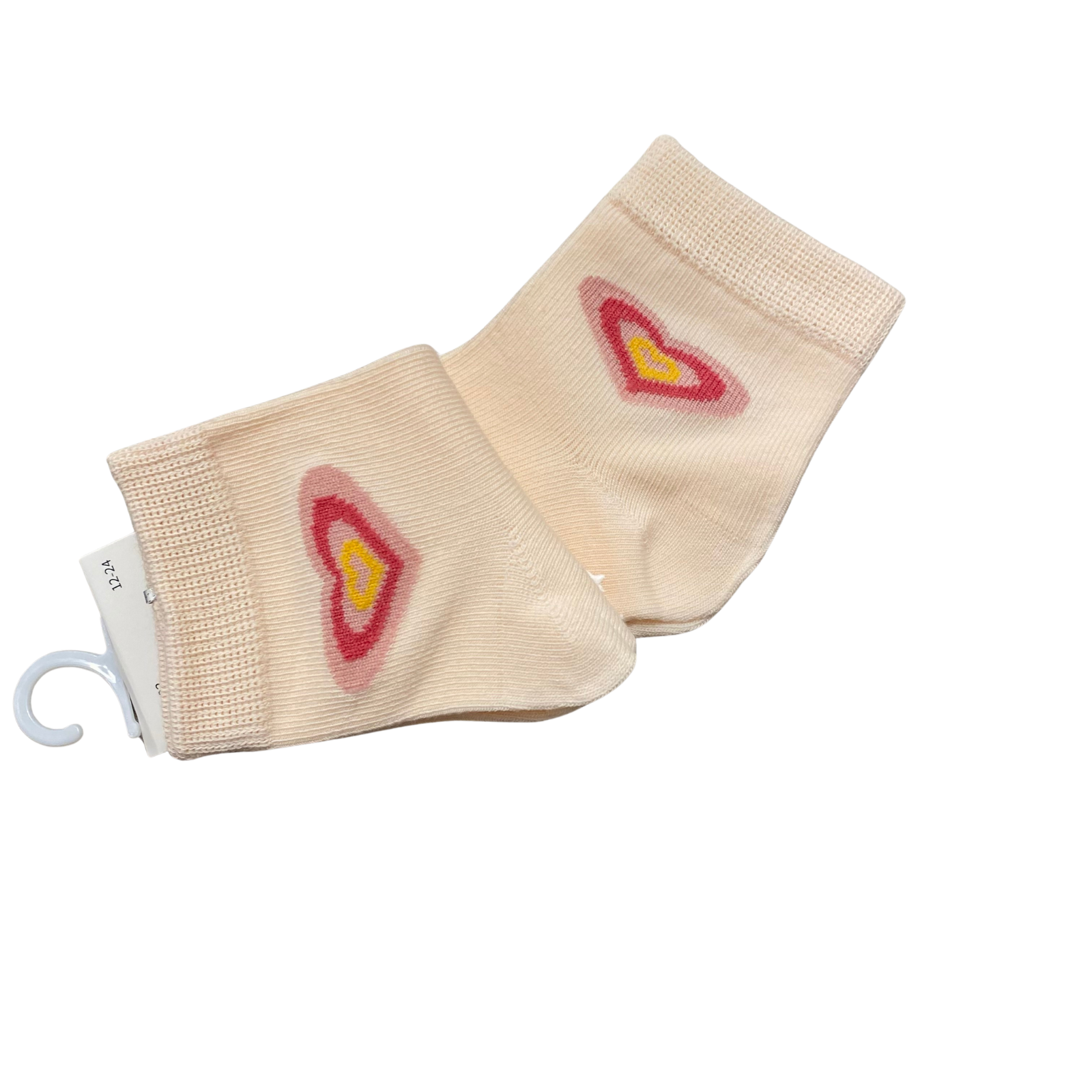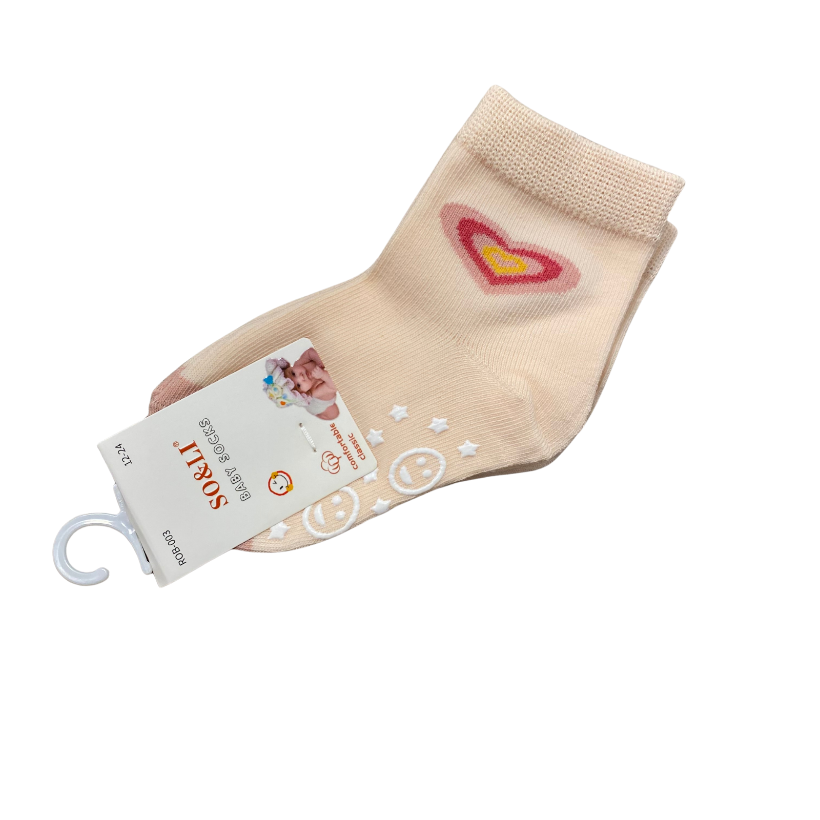 Șosetuțe antiderapante pentru bebeluși din bumbac moale (92%) și spandex (8%), cu inimioară roz. Confortabile, elastice și sigure pentru primii pași.
