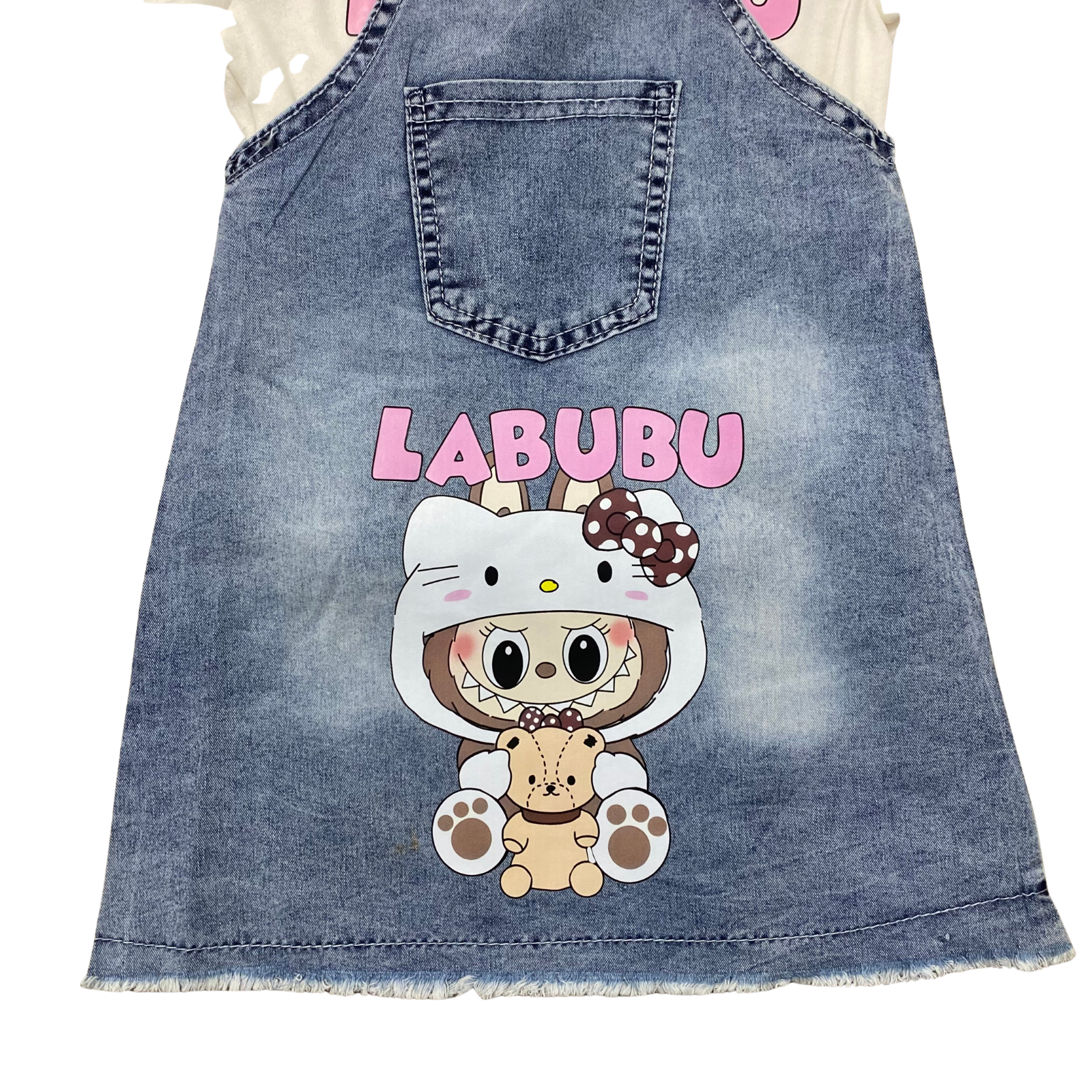 Rochiță tip salopetă din denim cu imprimeu colorat „Labubu” 🌸