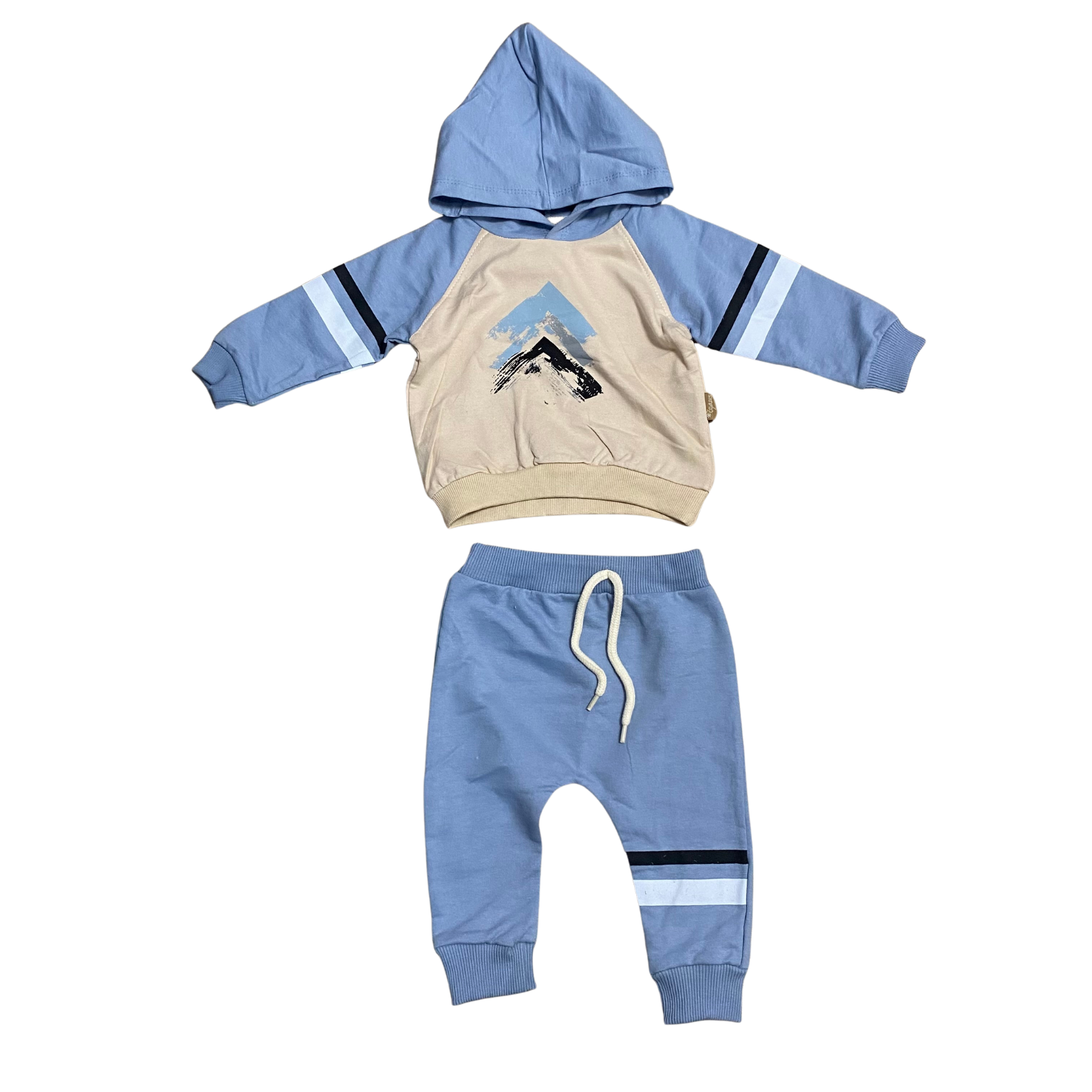 Trening modern pentru băieți, format din bluză cu glugă și pantaloni comozi, ideal pentru zilele active și confortabile. Bluza prezintă mâneci în două tonuri și un imprimeu geometric stilizat pe piept, oferind un aspect sport și jucăuș. Gluga protejează de vânt, iar manșetele elastice asigură o fixare lejeră. Pantalonii sunt prevăzuți cu talie elastică și șnur decorativ pentru o potrivire practică și sigură. Banda laterală colorată completează designul, oferind unitate vizuală setului. Țesătura moale și prietenoasă cu pielea îl face potrivit pentru purtare zilnică, grădiniță sau plimbări. Un set versatil, comod și stilat pentru orice sezon.