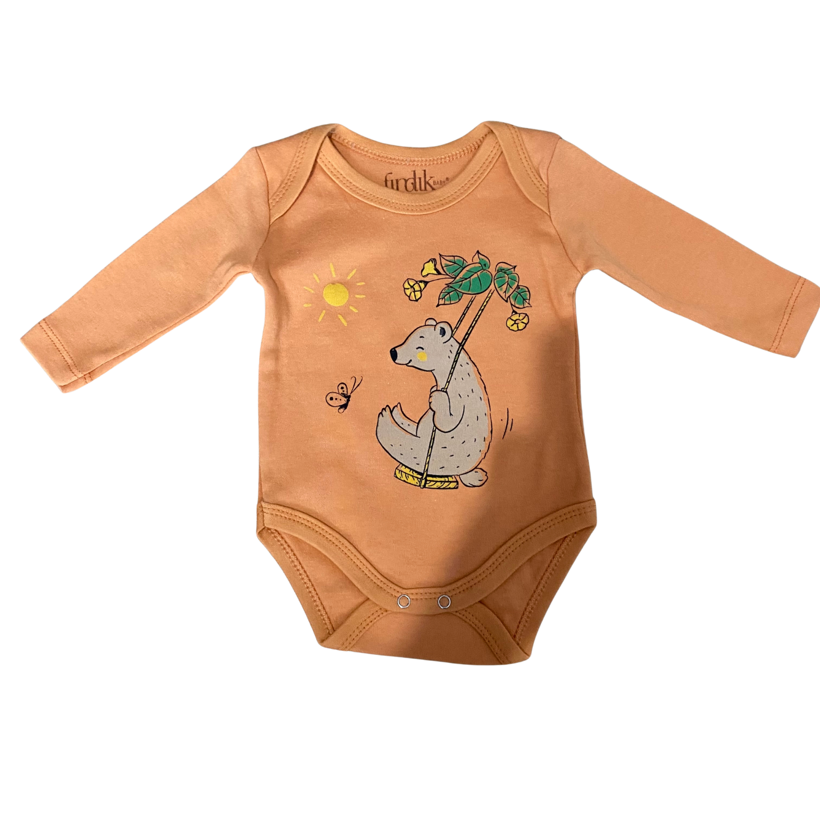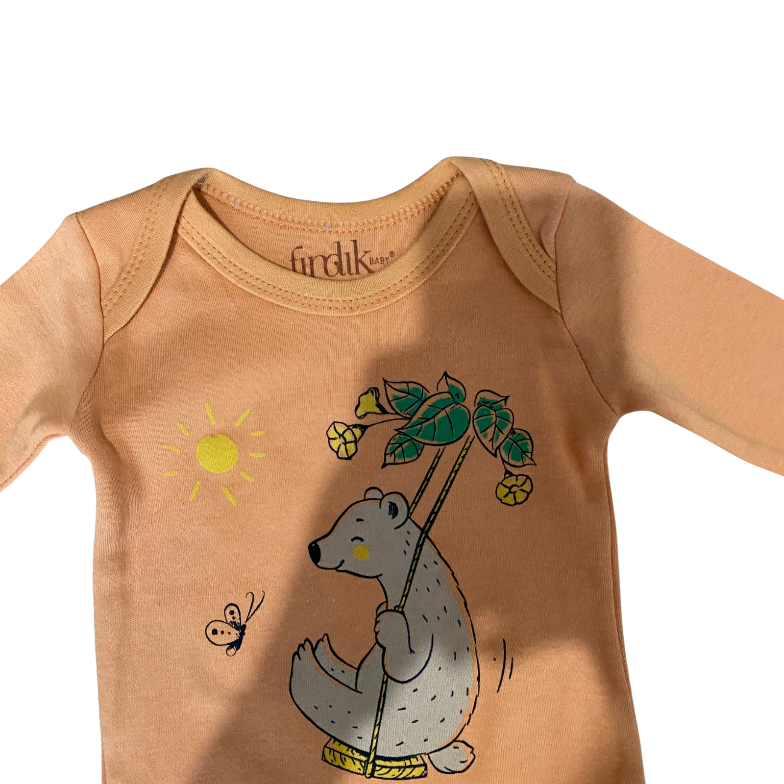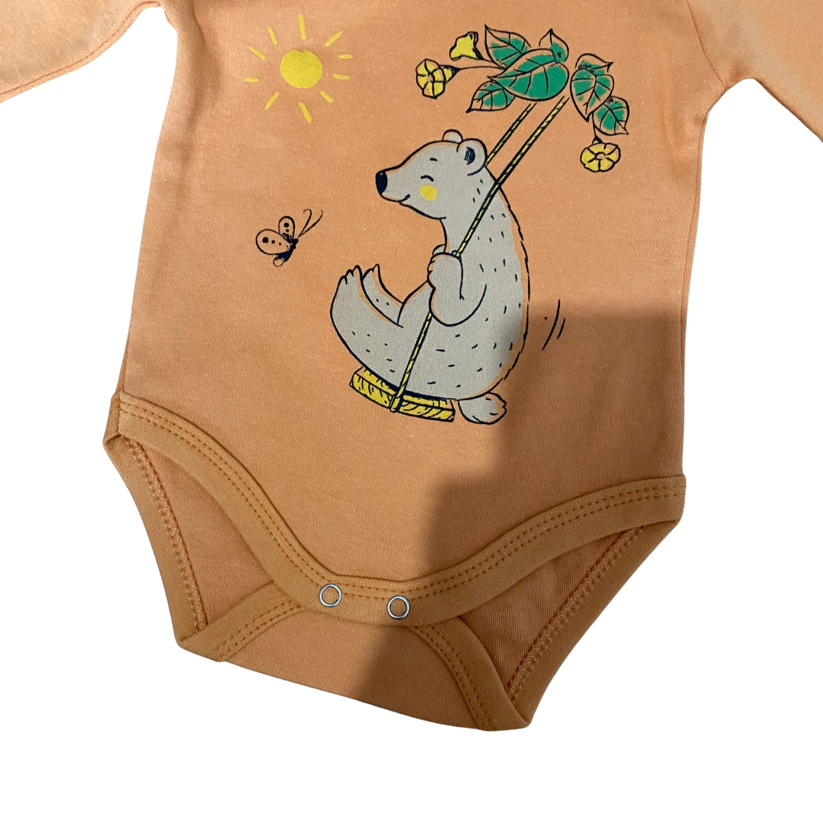 Body din bumbac moale, în nuanță portocaliu piersică, cu mânecă lungă și imprimeu ursuleț pe leagăn.