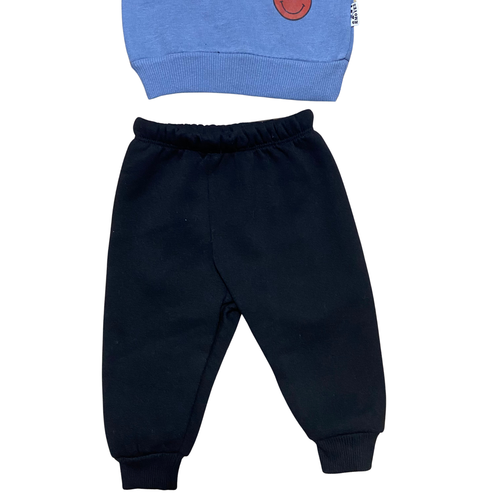 Compleu băiețel „HAPPY” – bluză albastră cu imprimeu zâmbete și pantaloni negri comozi.
