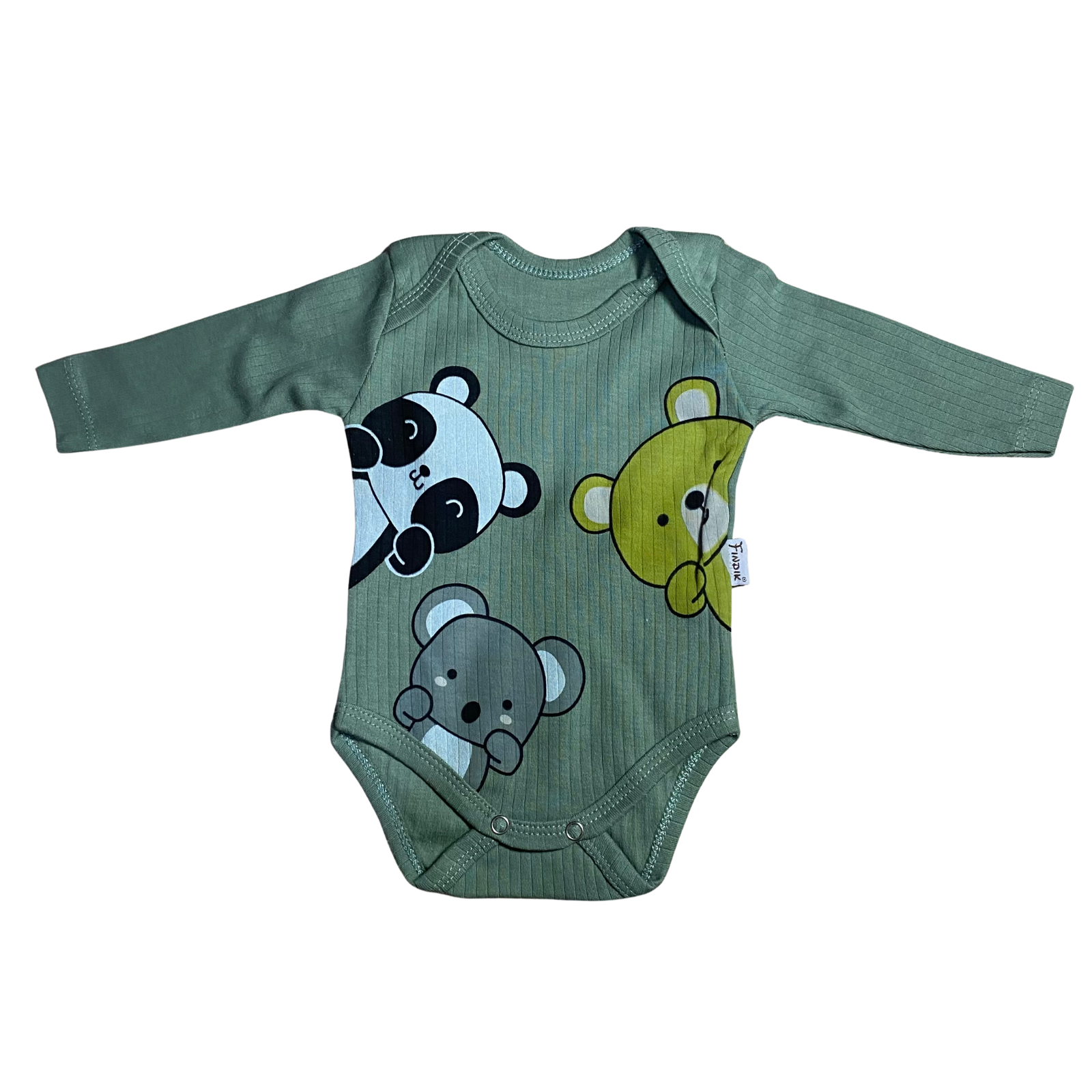 Body bebe verde reiat cu mânecă lungă și imprimeu ursuleți. Confortabil și ideal pentru sezon mai răcoros.