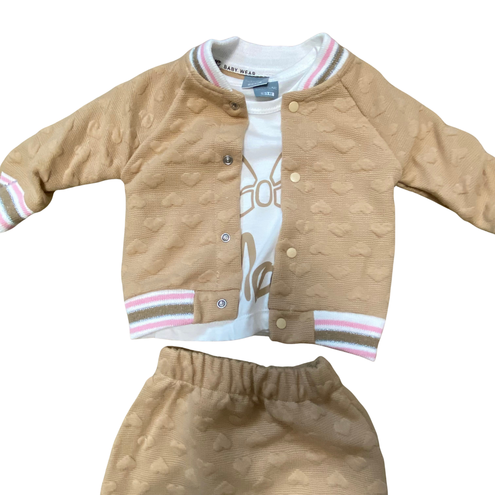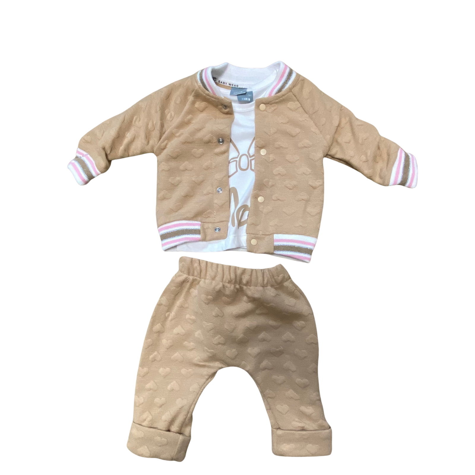 Set bebeluș bej din două piese cu inimioare reliefate, ideal pentru confort și stil natural.