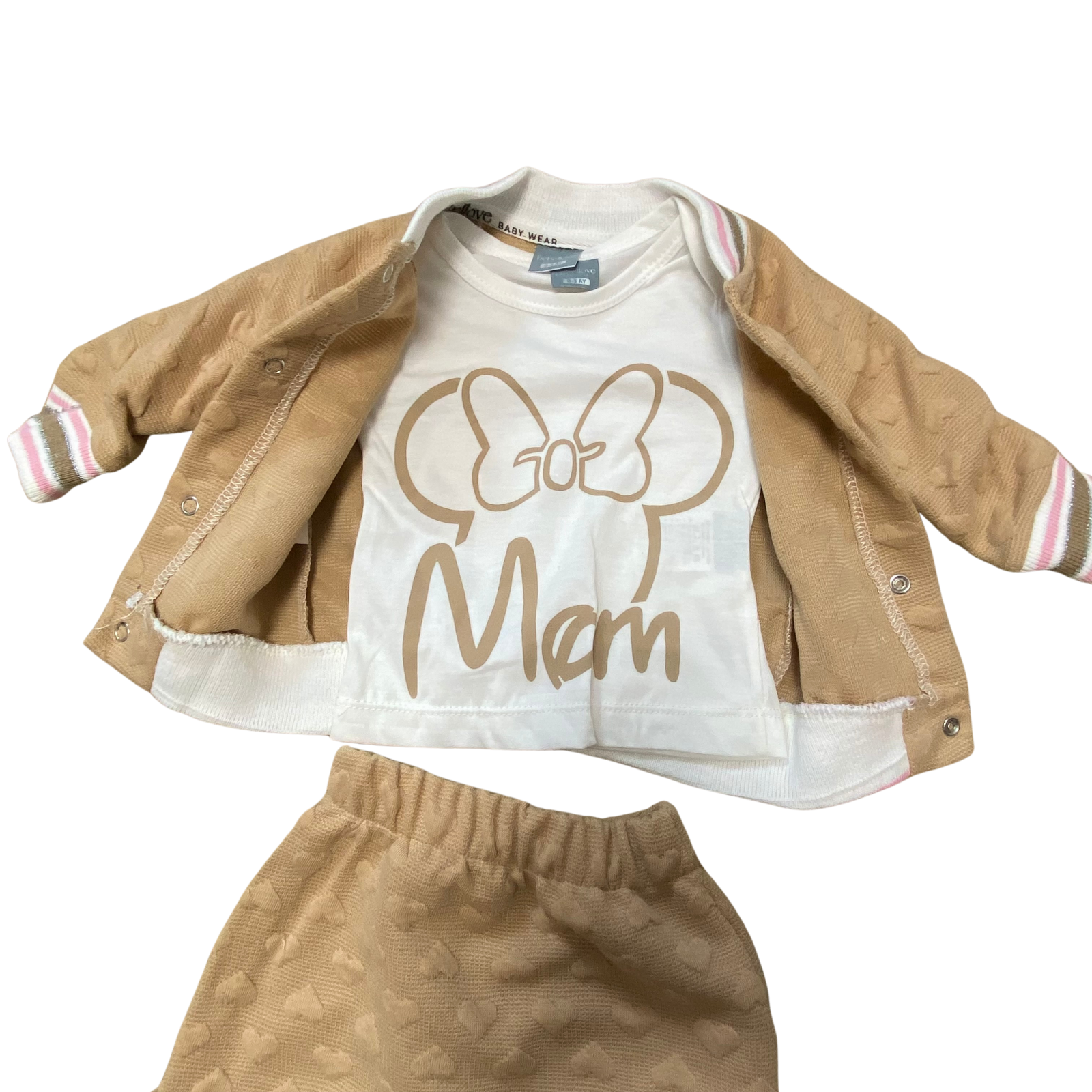 Setul pentru bebeluși în nuanță bej, format din bluză și pantaloni, este alegerea ideală pentru confortul zilnic al celor mici. Materialul moale, cu inimioare reliefate, oferă o senzație plăcută pe piele, fiind potrivit pentru toate anotimpurile. Bluza are mâneci lungi, se închide cu capse frontale și este decorată cu manșete și tivuri cu dungi pastelate roz-alb-verde, care adaugă o notă delicată și modernă. Pantalonii asortați au talie elastică și manșete rulate pentru o fixare lejeră. Perfect pentru joacă, plimbări sau ținute casual de zi cu zi.
