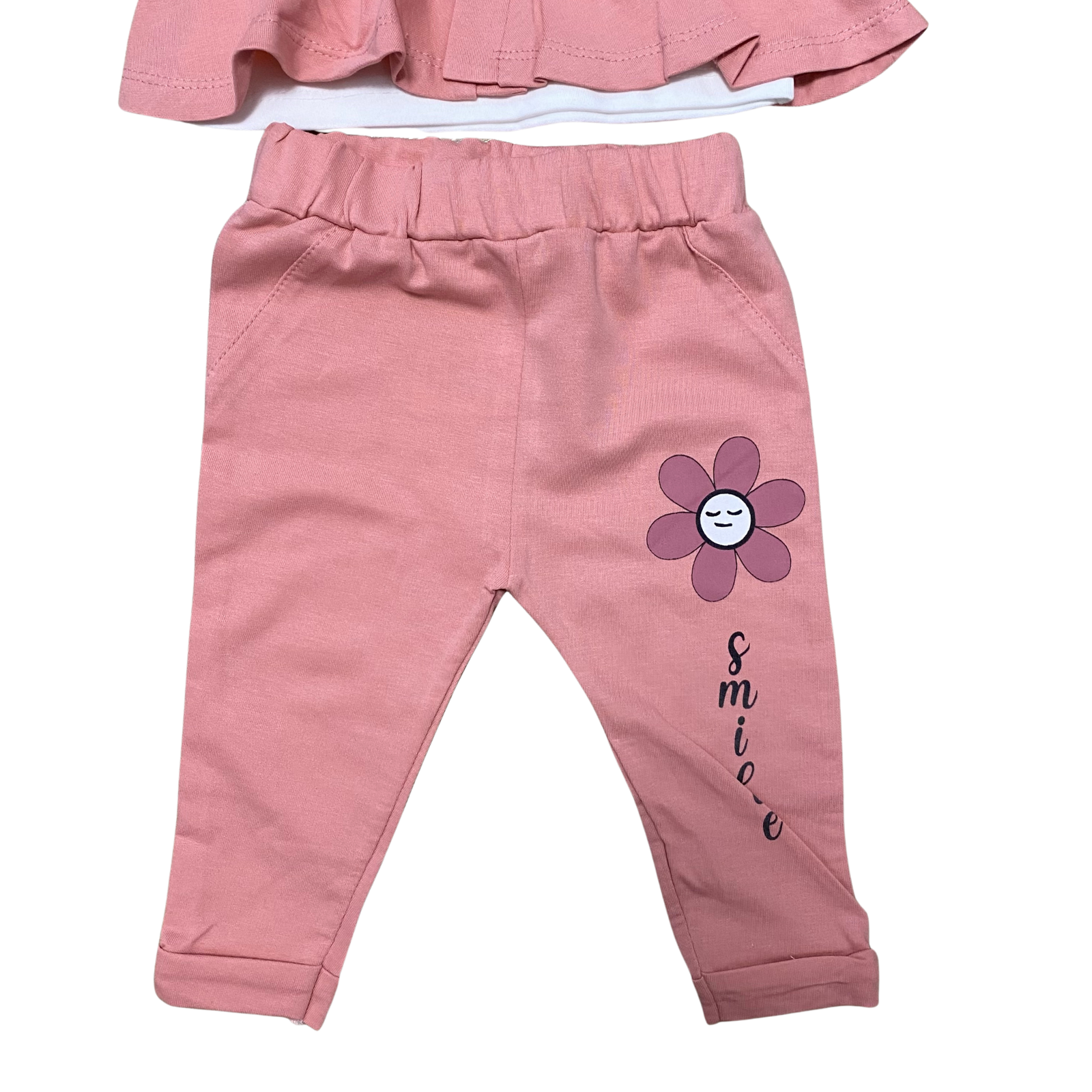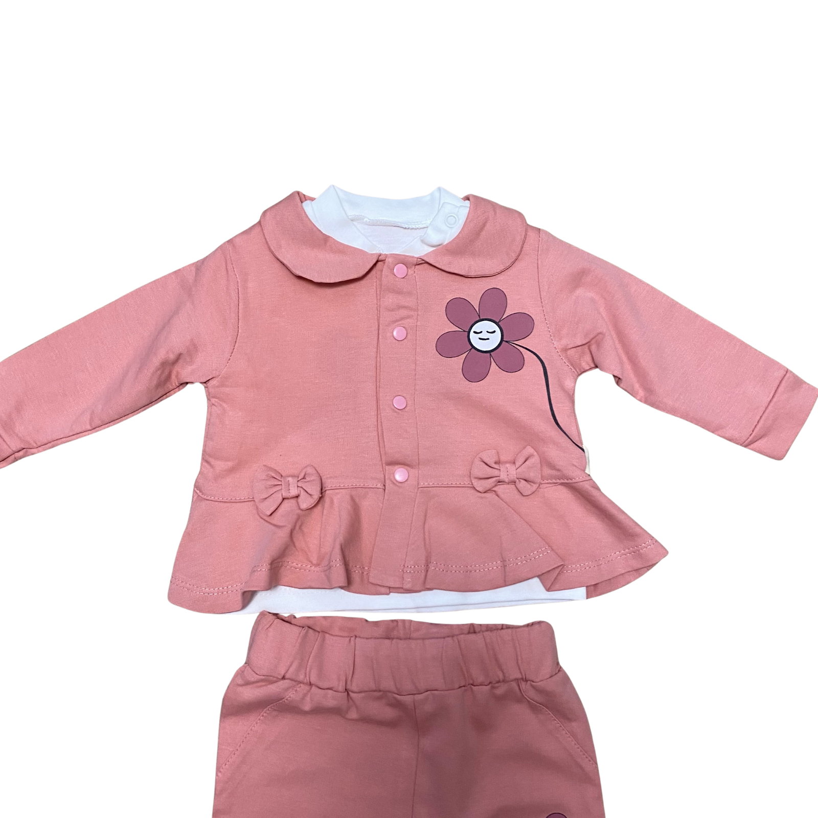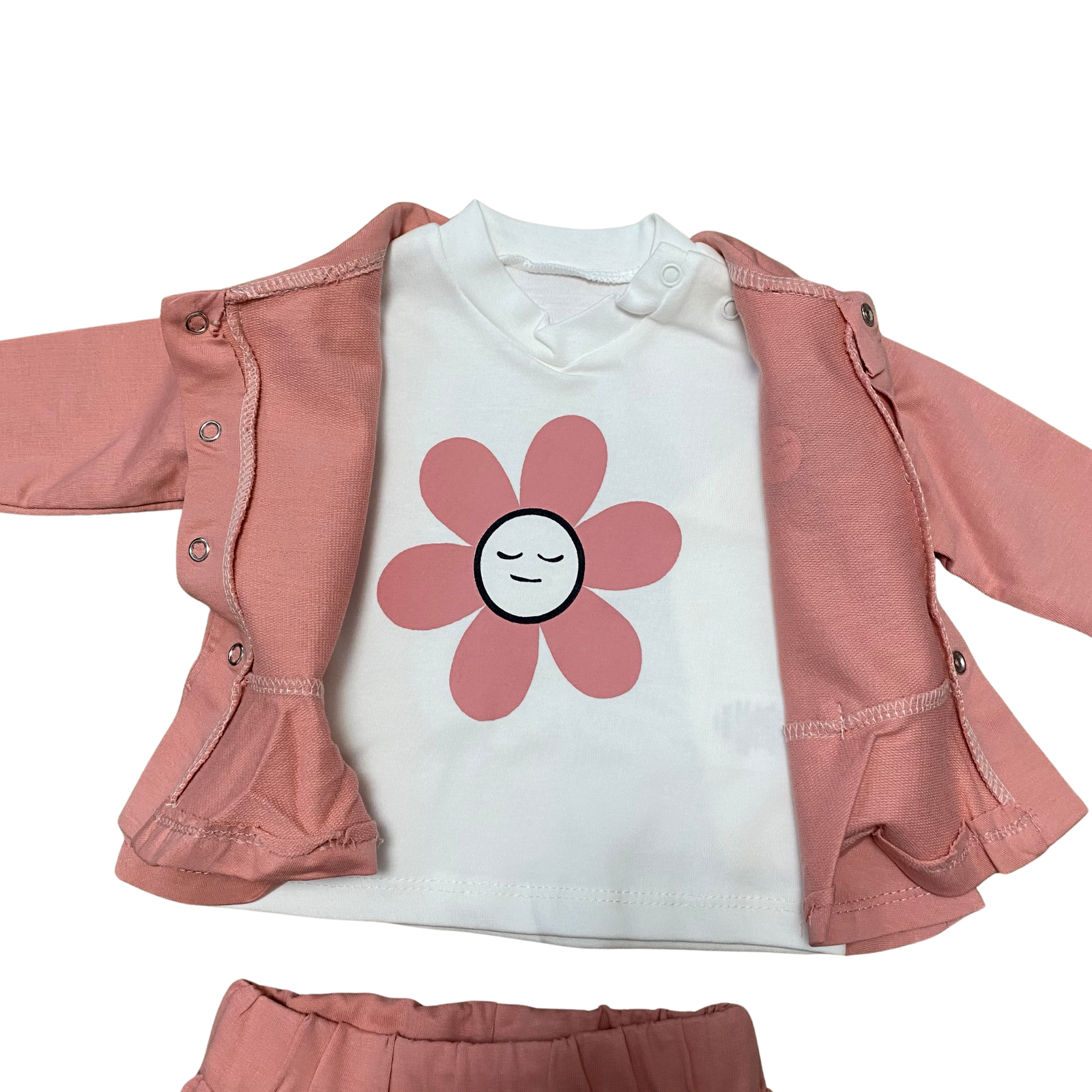 Set roz din bumbac cu imprimeu floare „Smile” și jachetă cu fundițe