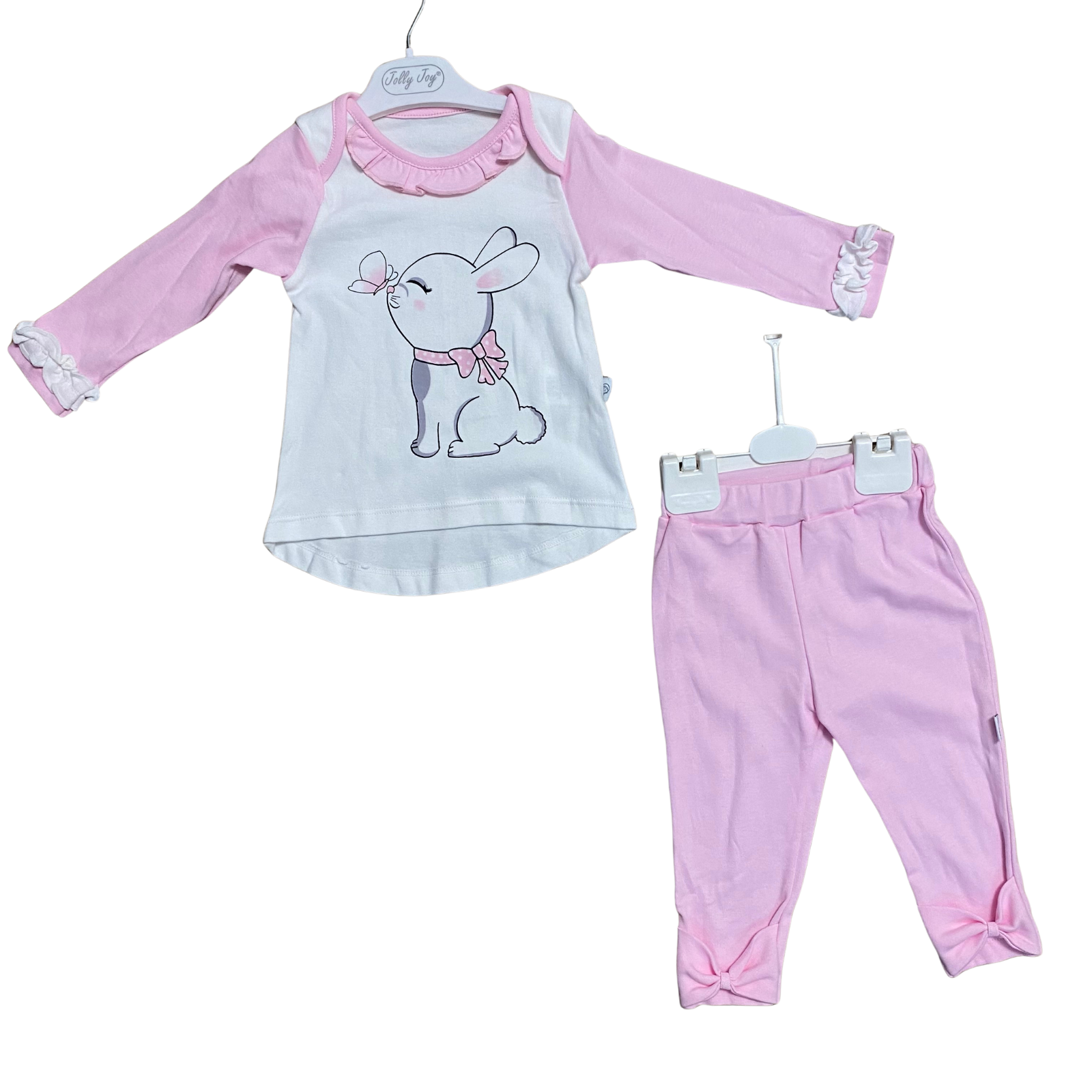 Set pentru copii din două piese, cu bluză cu iepuraș și volănașe, plus colanți elastici în culori pastel. Ușor, confortabil și adorabil pentru purtare zilnică.
