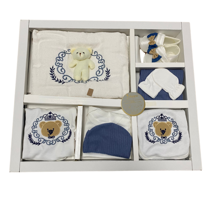 Set nou-născut din bumbac 100%, 10 piese, cu imprimeu ursuleț. Moale, complet și practic, ideal pentru maternitate sau cadou de botez.