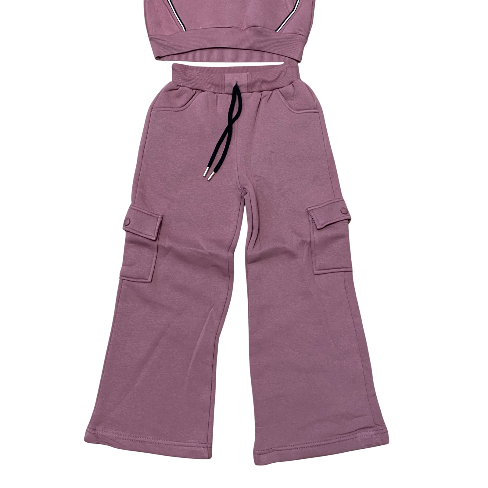 Set modern din două piese, confecționat din material moale și plăcut la atingere. Hanoracul are glugă, buzunar tip marsupiu și detalii decorative pe mâneci, oferind un aspect urban și actual. Pantalonii cargo prezintă buzunare laterale funcționale și croială ușor evazată, pentru libertate de mișcare și un plus de stil. Setul este confortabil, practic și versatil, ideal pentru activități zilnice, plimbări sau momente de relaxare.