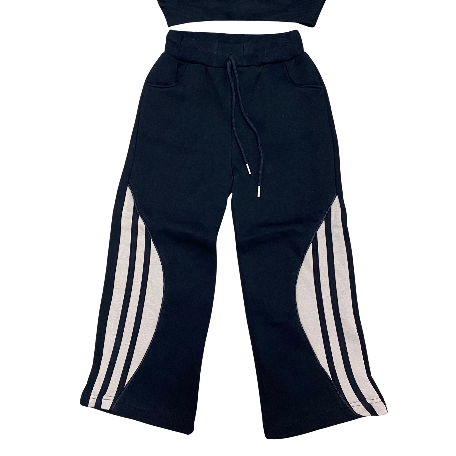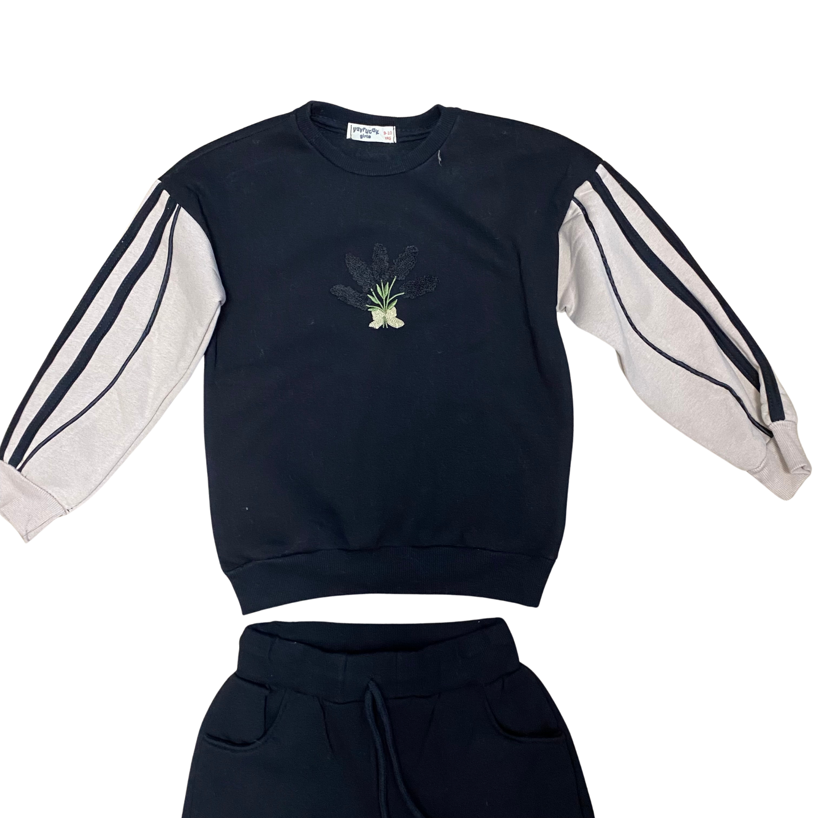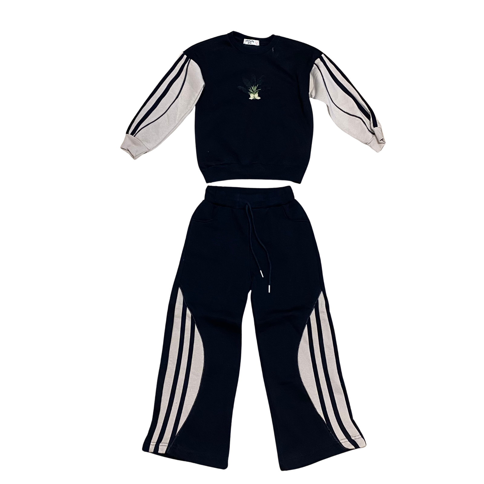 Trening copii din bumbac 100%, 2 piese, cu dungi laterale și broderie decorativă. Confortabil, modern și ideal pentru activități zilnice.