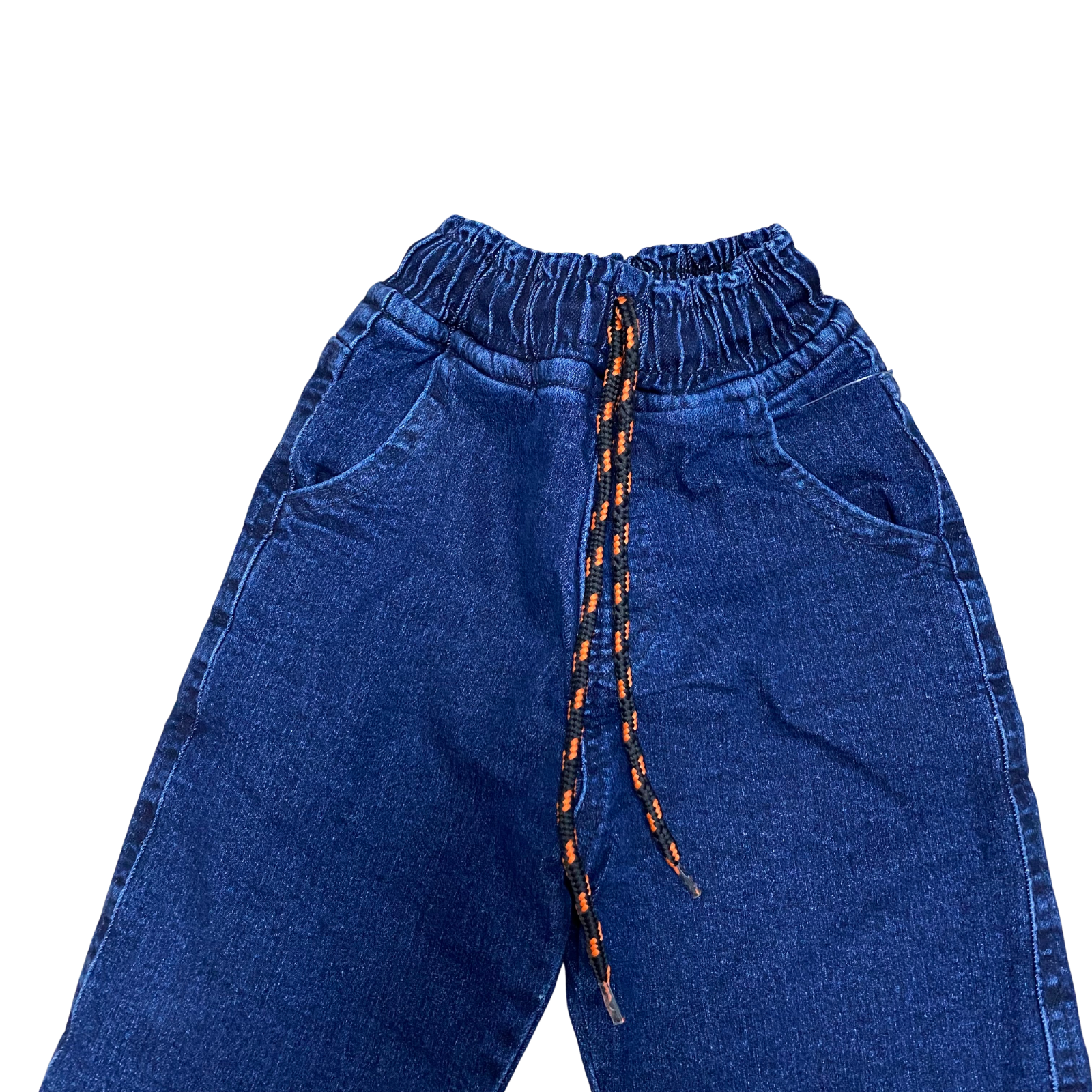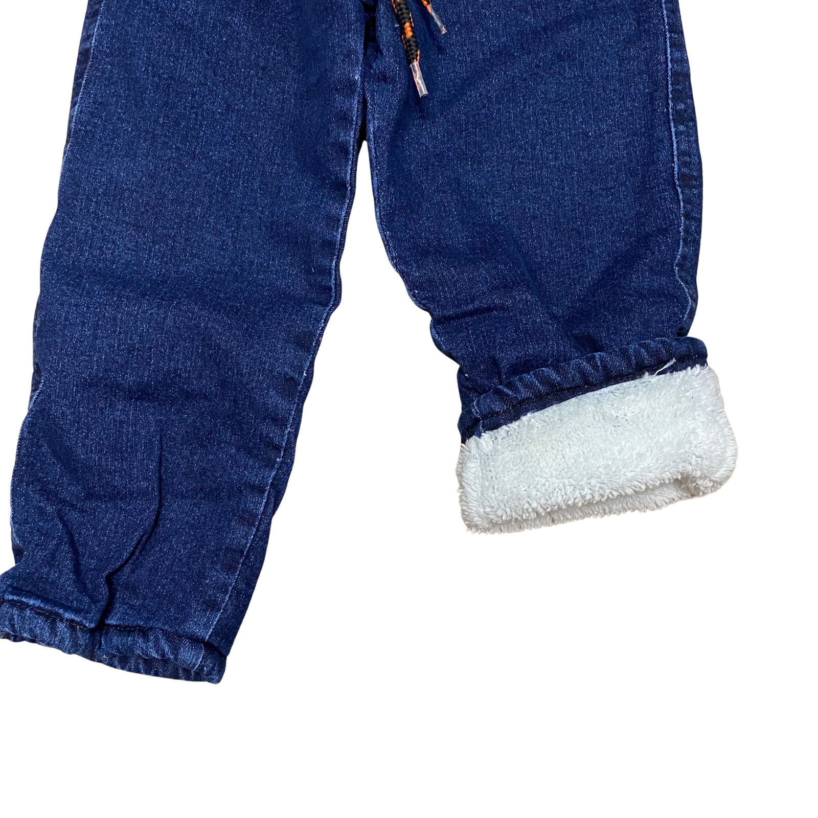 Pantaloni din denim albastru închis, căptușiți cu blană moale, cu talie elastică și șnur reglabil.