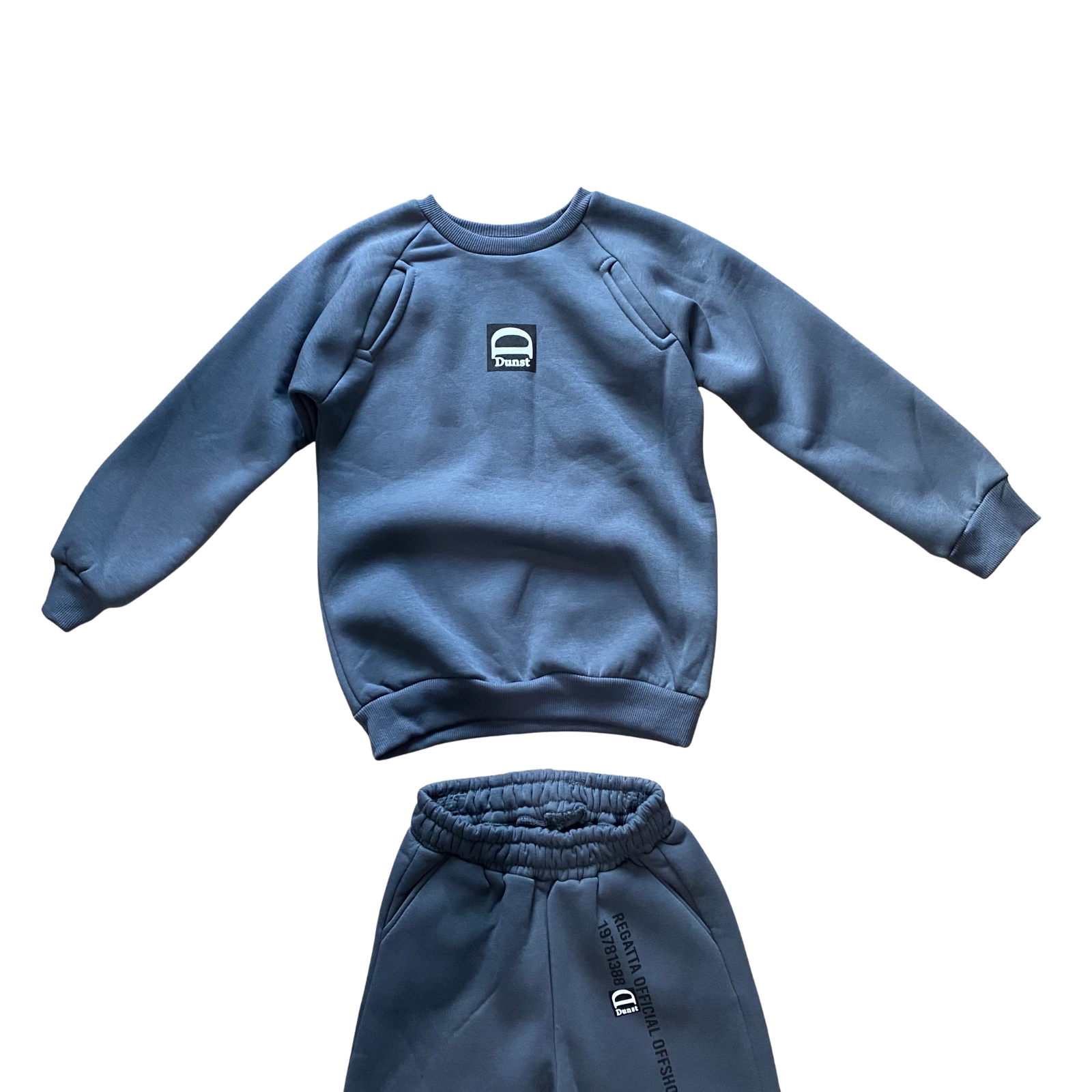 Set din două piese, confecționat din material moale și confortabil, potrivit pentru purtare zilnică. Bluza are croială simplă, cu guler rotund și mâneci lungi, iar pantalonii sunt prevăzuți cu talie elastică și manșete la bază pentru o potrivire comodă. Pe picior este aplicat un imprimeu modern cu textul „Dunst”, care adaugă o notă sportivă și contemporană. Nuanța albastru prăfuit oferă un aspect echilibrat și ușor de asortat, ideal pentru activități de zi cu zi, joacă sau relaxare.